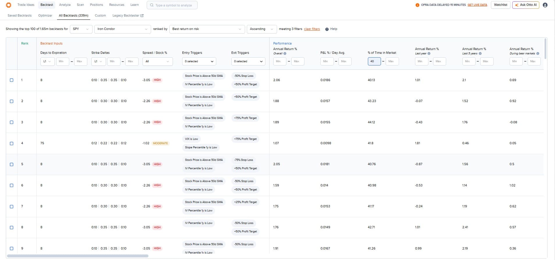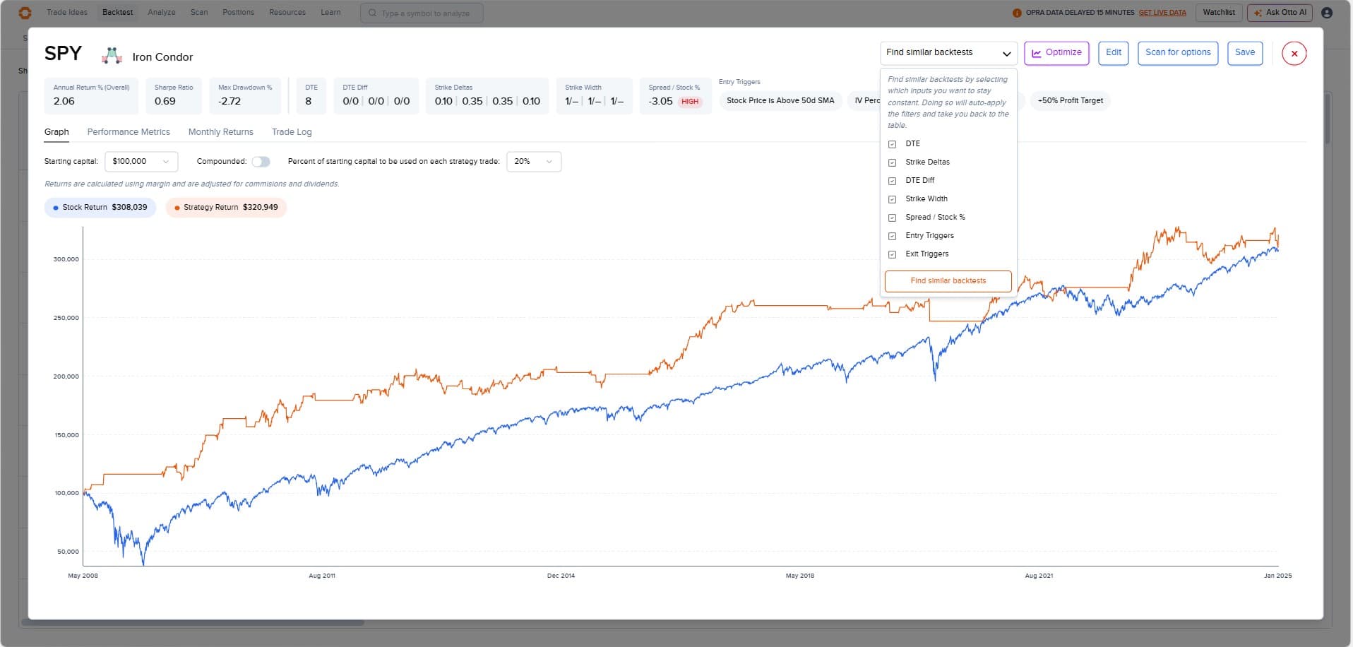 The backtest finder tests multiple stop losses (-25%, -50%, -75%) and profit targets (+25% to +300%). Understand how different exit rules affected historical performance before deploying capital.